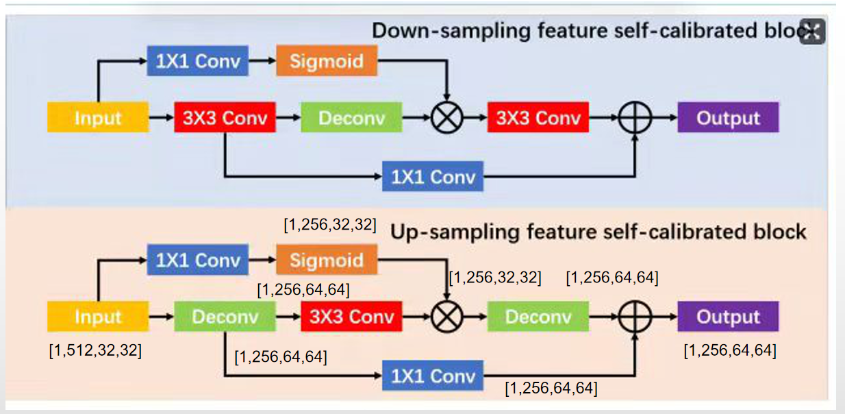 (1)提出了新的下采样特征自校准块down-sampling feature self-calibrated block(DFSB)和上采样特征自校准块 up-sampling feature self-calibrated block(UFSB)作为特征编码器和解码器的基本块,以提高特征表示能力。